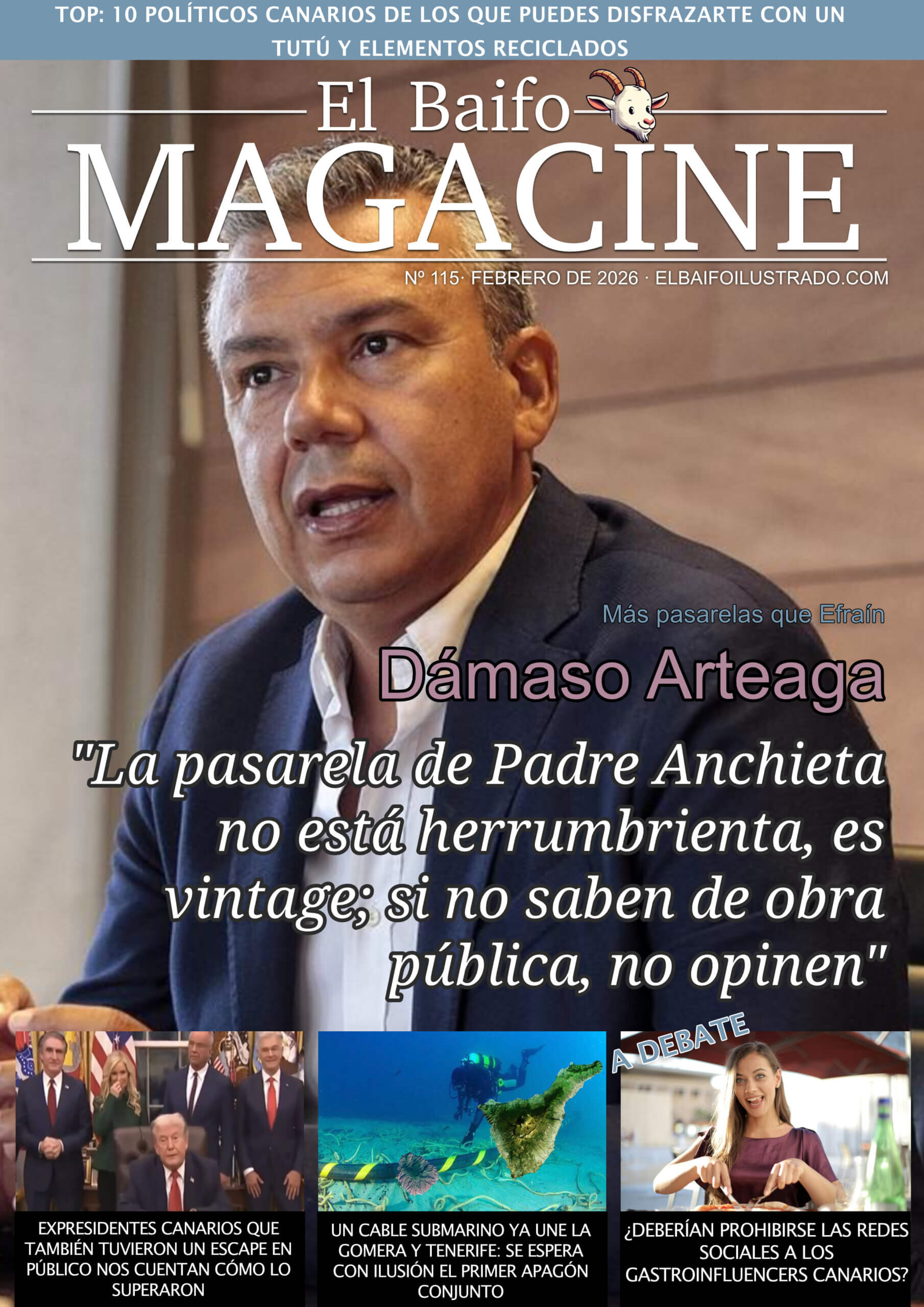 Revistas Dámaso Arteaga, en la portada de El Baifo Magacine: «Si no saben de obra pública, no opinen» 7 febrero, 20266 febrero, 2026 Maruca JohnsonEl consejero de Carreteras del Cabildo de Tenerife aborda en El Baifo Magacine la polémica por el aparente estado de deterioro de la aún no inaugurada pasarela de Padre Anchieta, en La Laguna. Entradas relacionadas Revistas Néstor Martín Fernández de la Torre, en la portada de El Baifo Magacine: «Le han puesto mi obra a un acuario» 3 enero, 20261 enero, 2026 Maruca Johnson Revistas «La Hartanga», la revista temática navideña de El Baifo Ilustrado 15 diciembre, 20256 febrero, 2026 Maruca Johnson